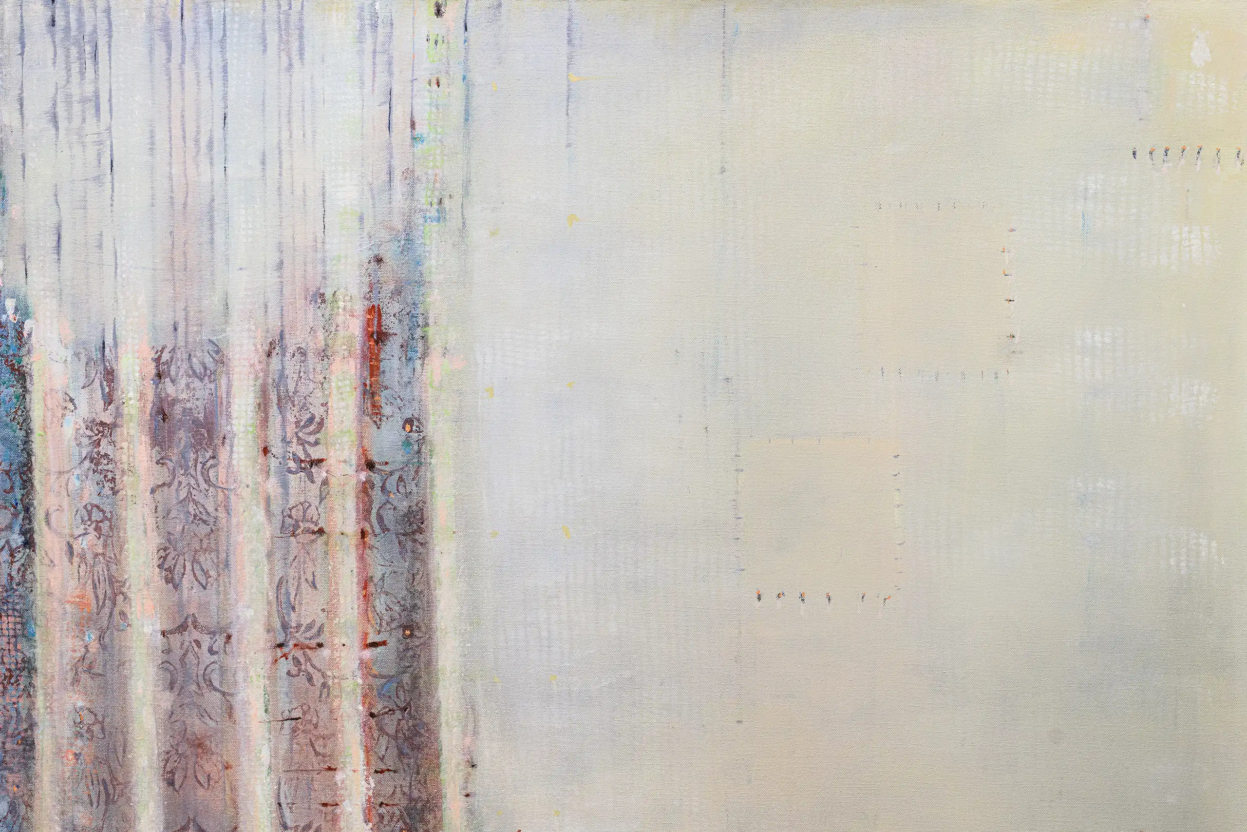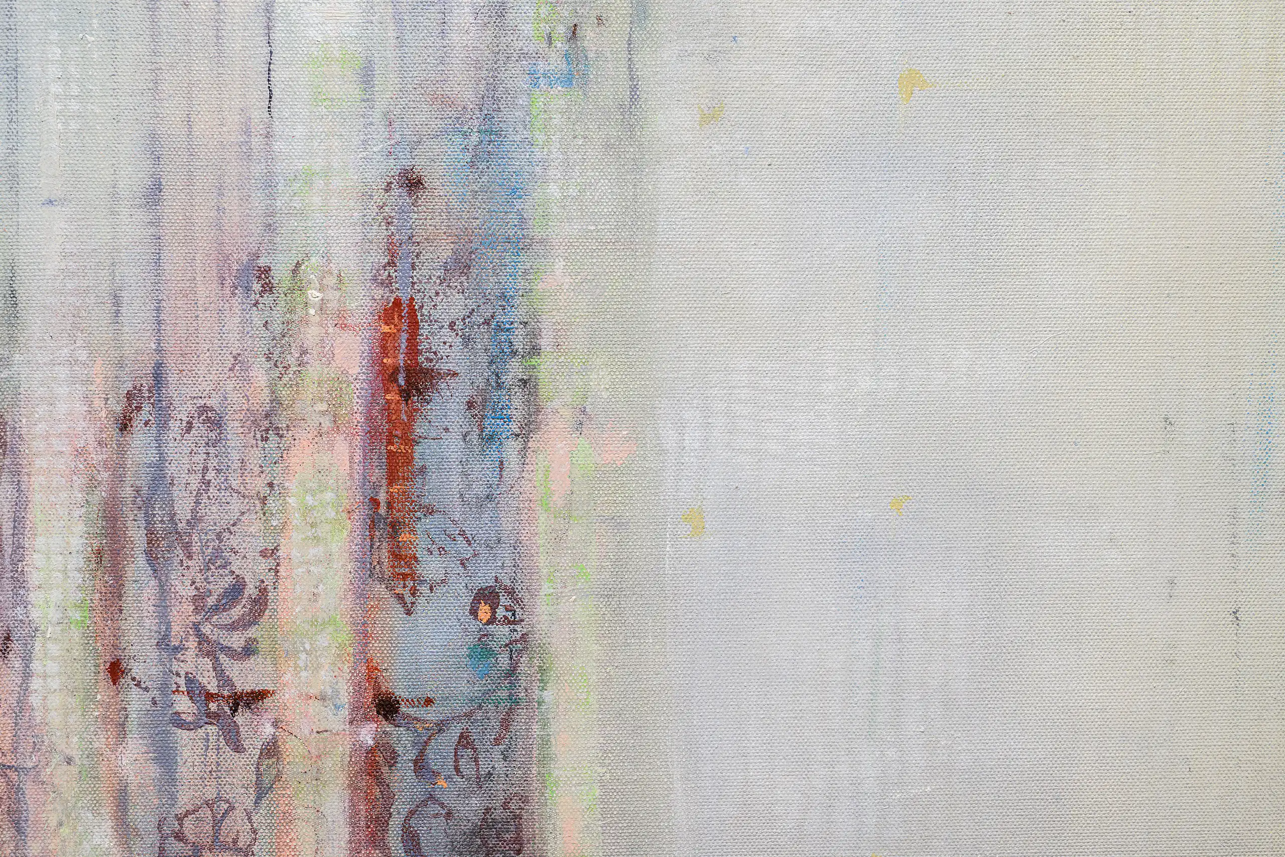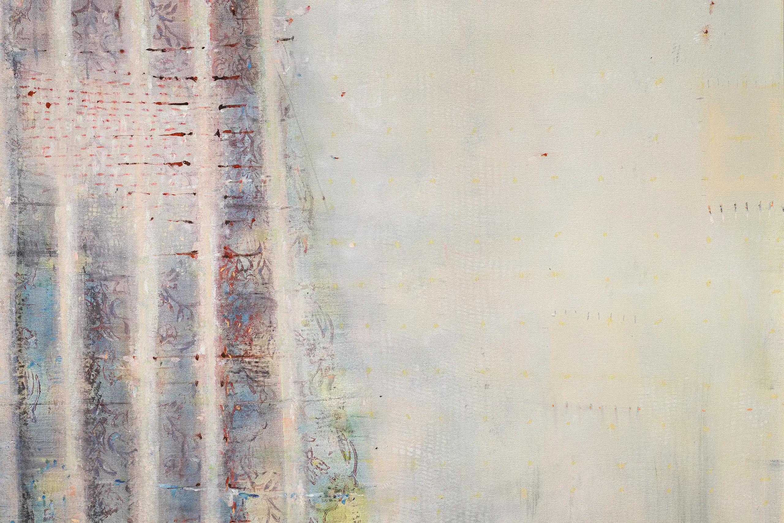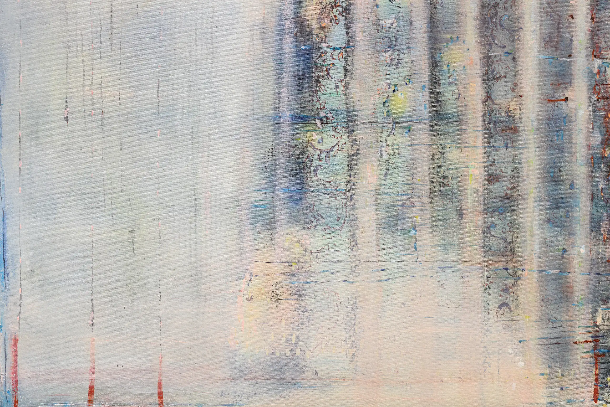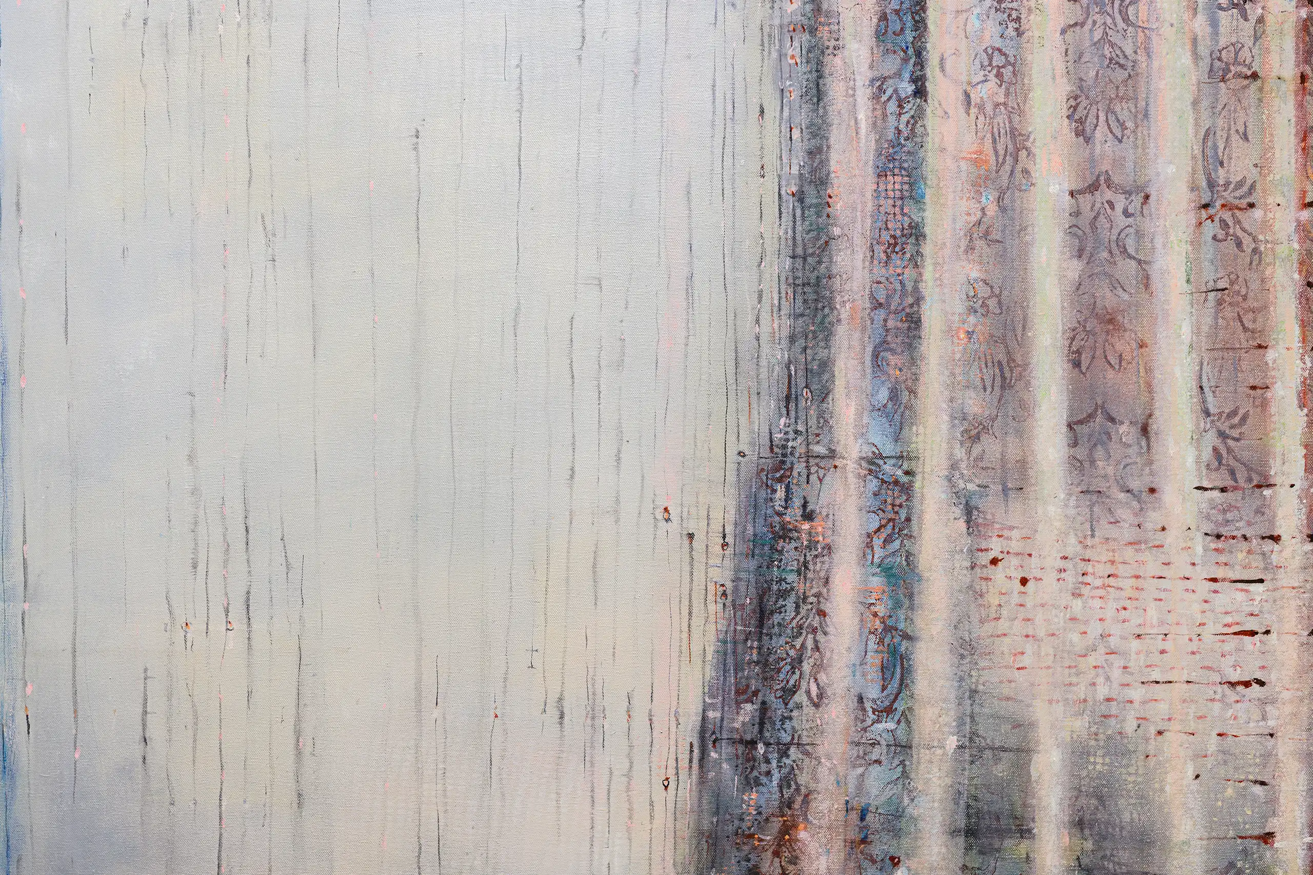 My painting process is that of patiently and delicately building up thin layers of oil paint on canvas, forms lying over forms, feeling nearer or further away in relation to one another. Past ages of paint disappear, saturate, and edges dissolve, or I will rub back to reveal the history that has been. I savour the handling of paint. The pulsating mark-making will then contrast with a rhythmic movement of washes of colour that stain or move across the plane. The paintings emerge. They need time. I am drawn to a vital physicality in the act of painting.