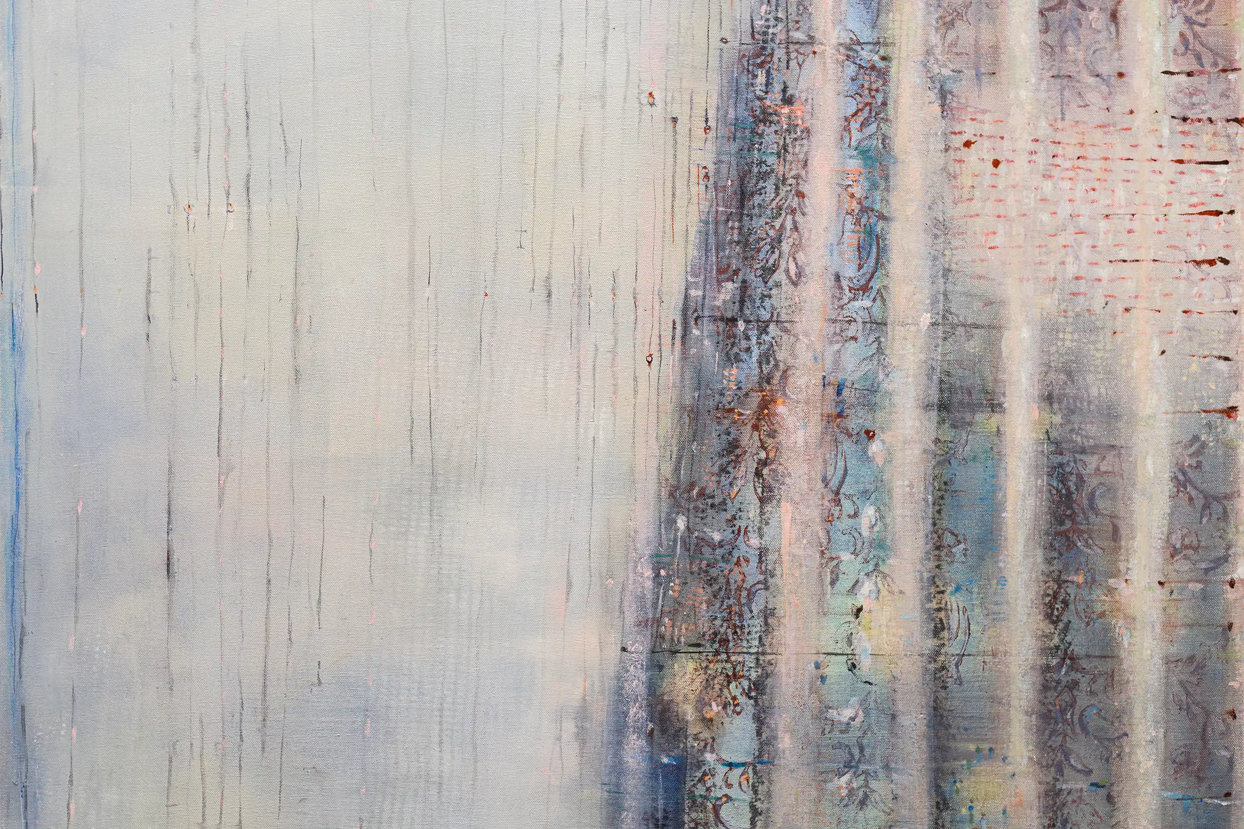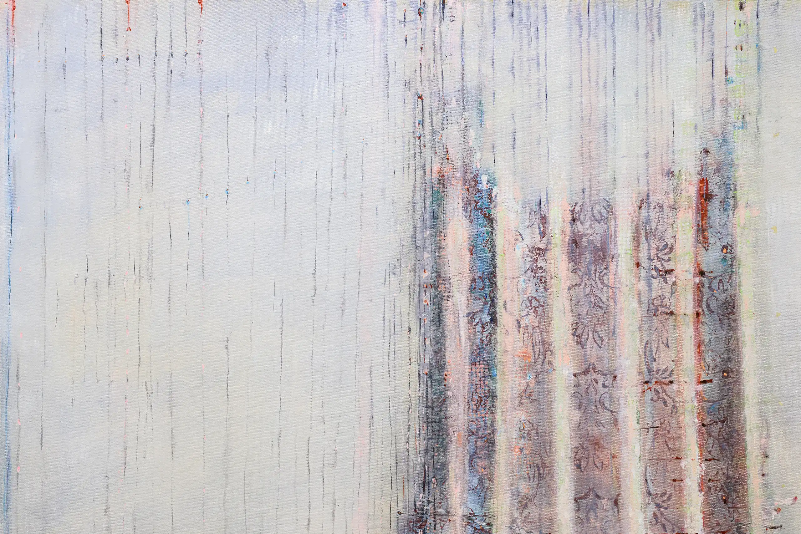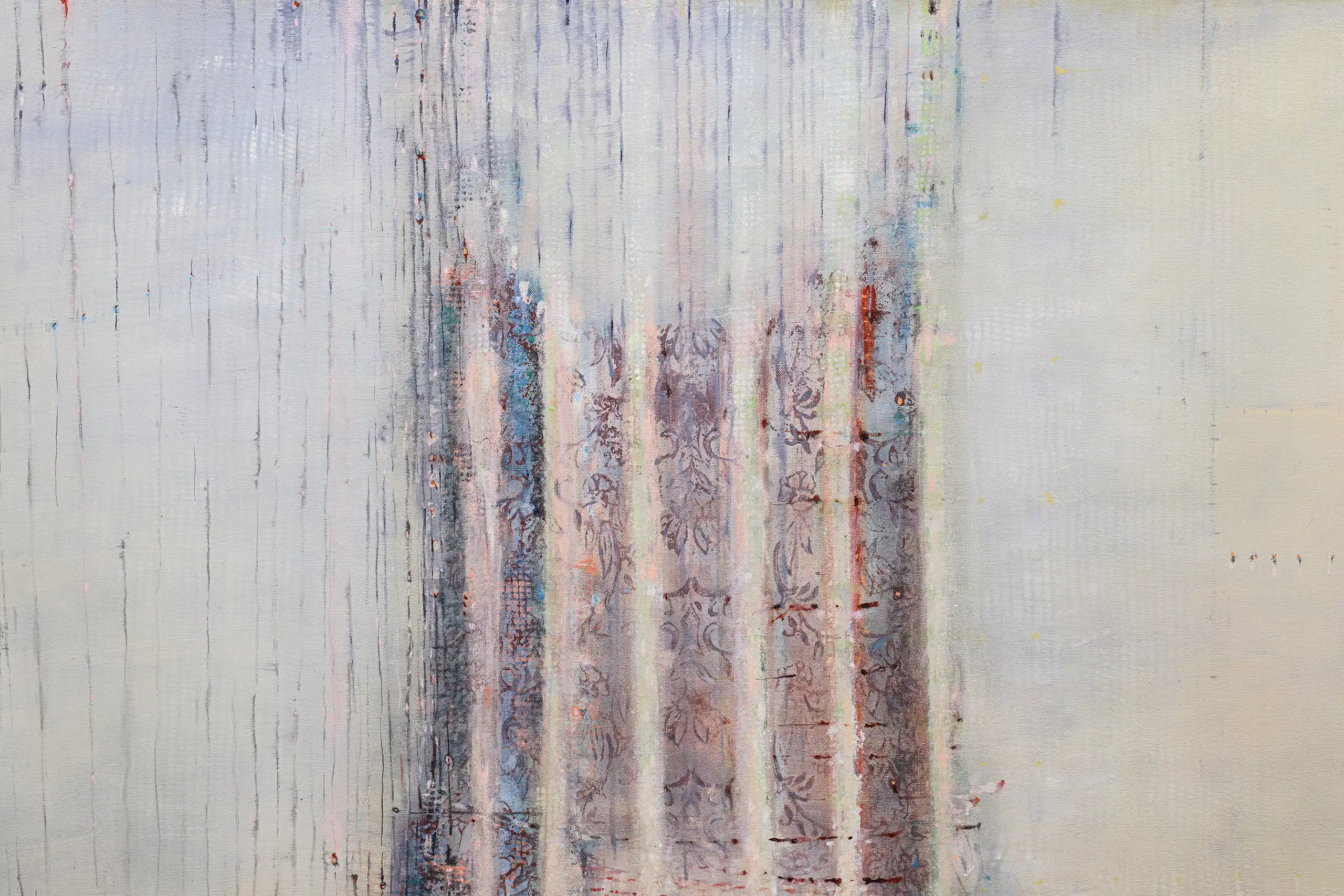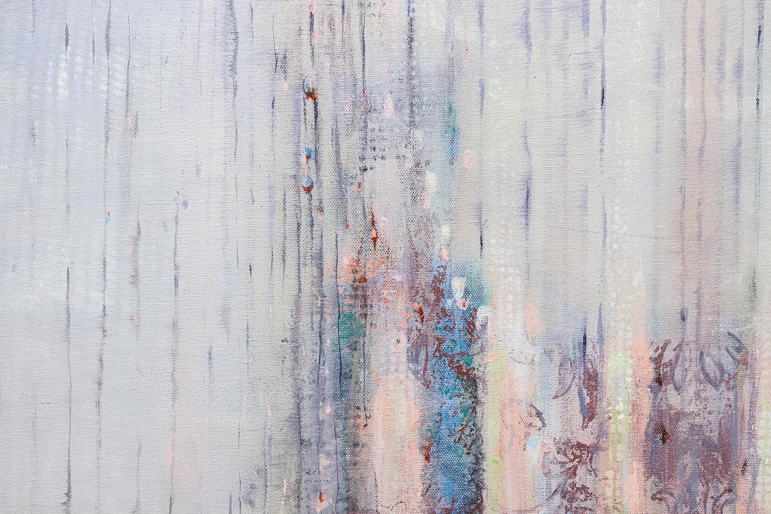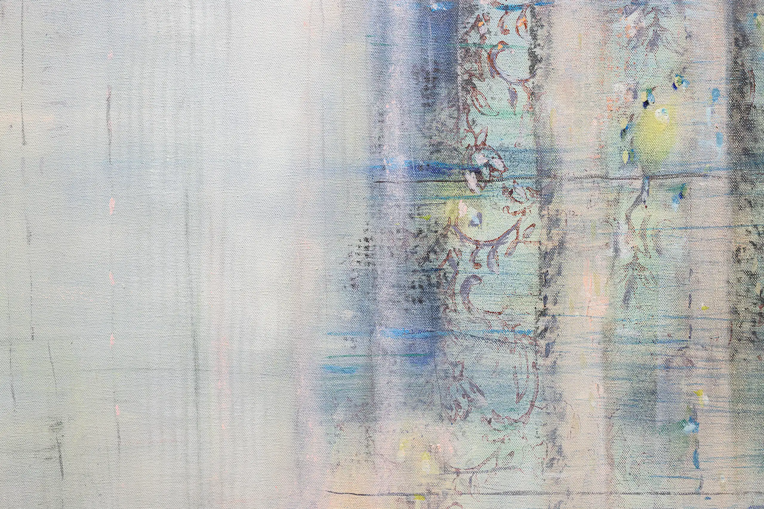 My painting process is that of patiently and delicately building up thin layers of oil paint on canvas, forms lying over forms, feeling nearer or further away in relation to one another. Past ages of paint disappear, saturate, and edges dissolve, or I will rub back to reveal the history that has been. I savour the handling of paint. The pulsating mark-making will then contrast with a rhythmic movement of washes of colour that stain or move across the plane. The paintings emerge. They need time. I am drawn to a vital physicality in the act of painting.