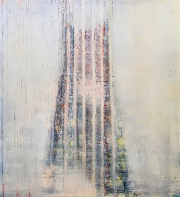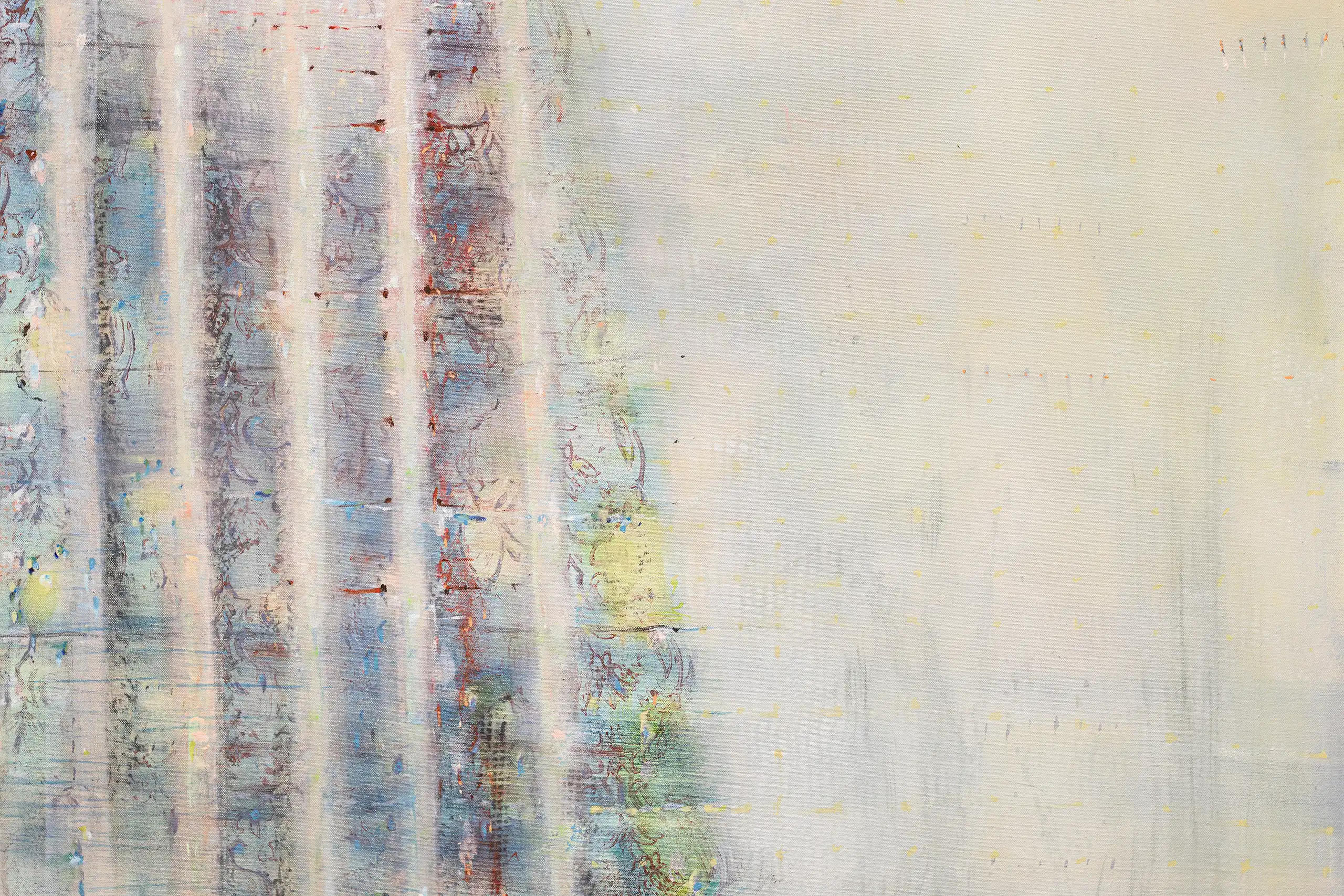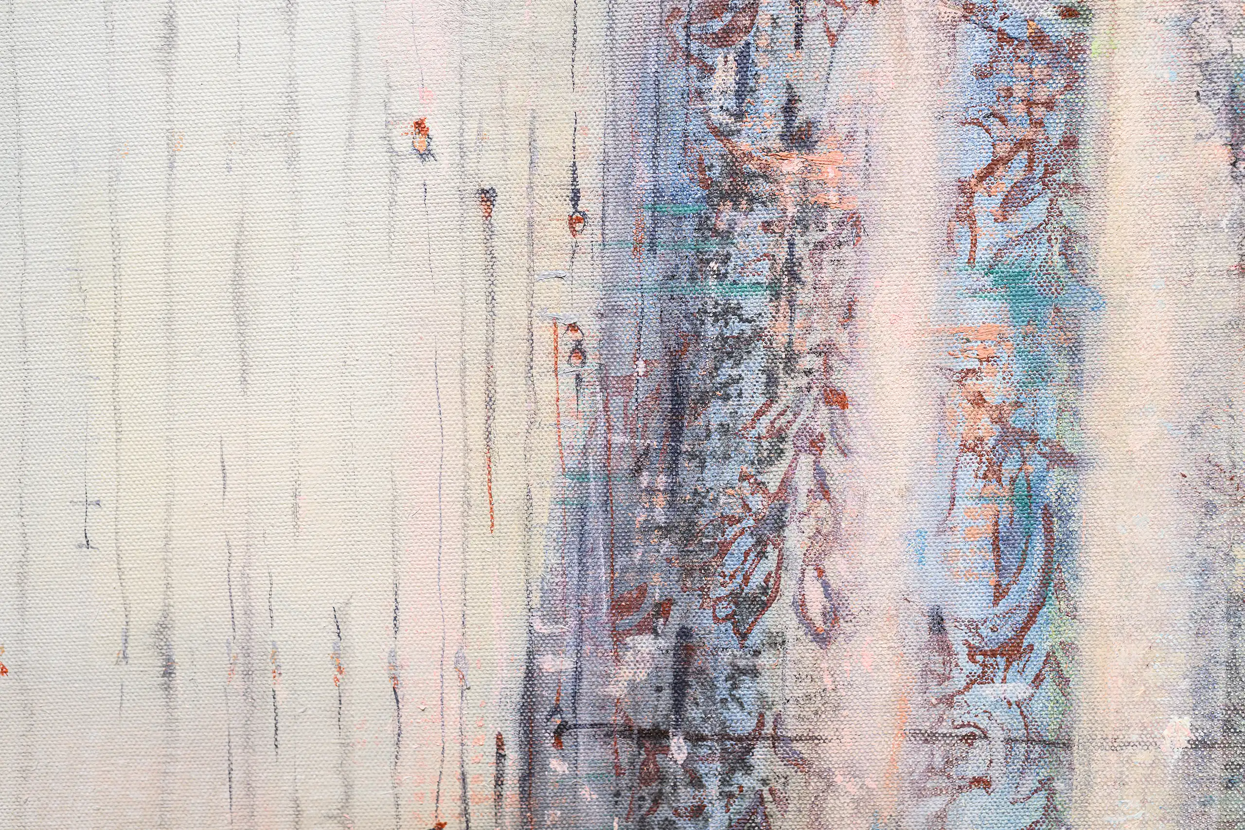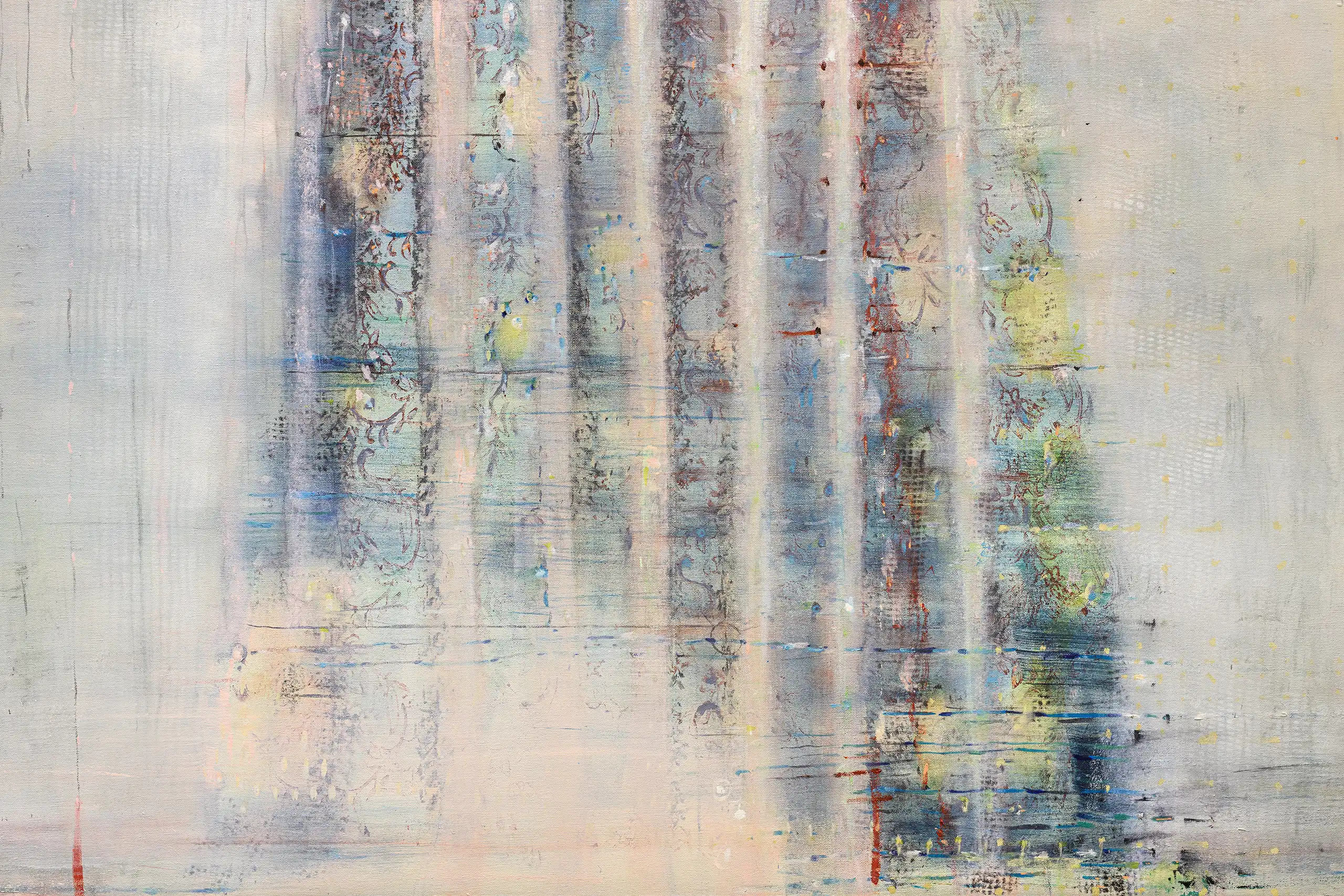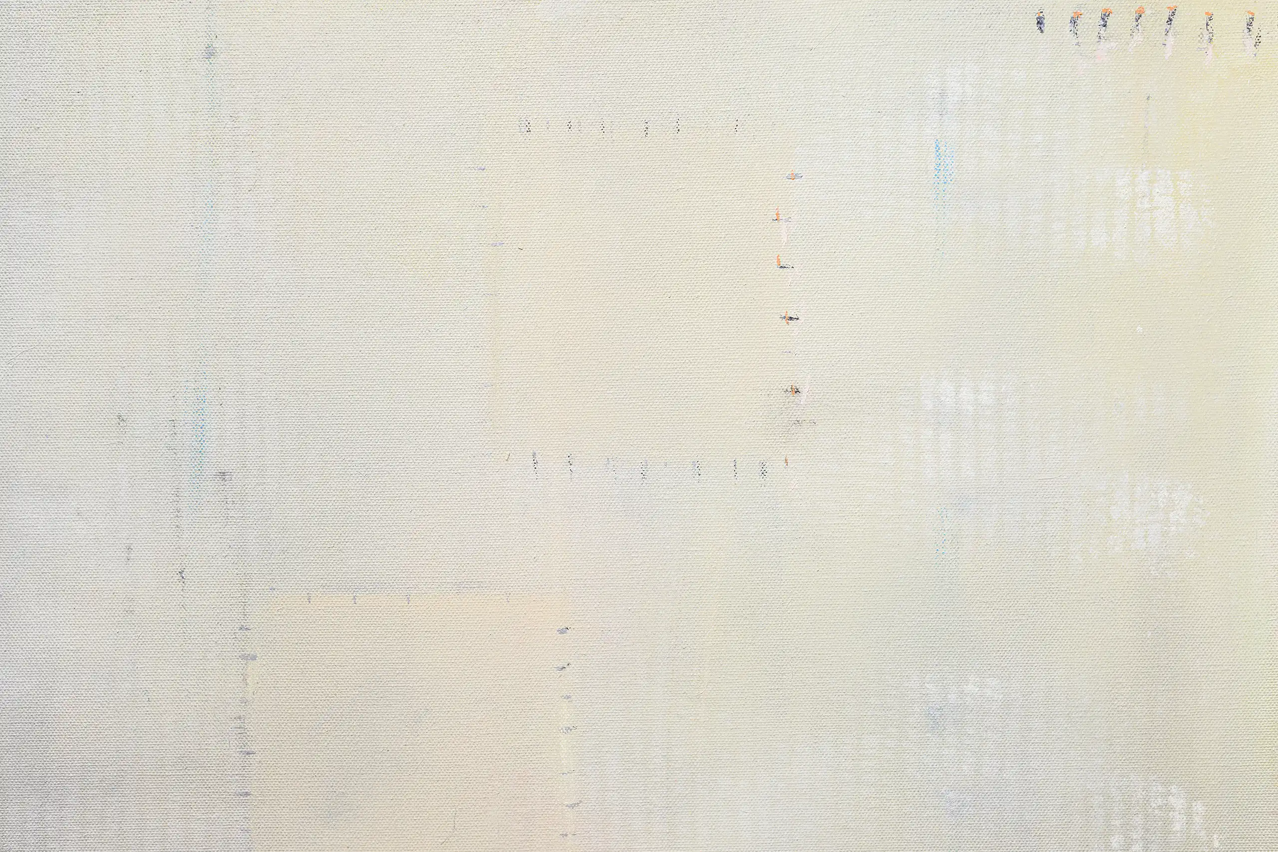 My painting process is that of patiently and delicately building up thin layers of oil paint on canvas, forms lying over forms, feeling nearer or further away in relation to one another. Past ages of paint disappear, saturate, and edges dissolve, or I will rub back to reveal the history that has been. I savour the handling of paint. The pulsating mark-making will then contrast with a rhythmic movement of washes of colour that stain or move across the plane. The paintings emerge. They need time. I am drawn to a vital physicality in the act of painting.