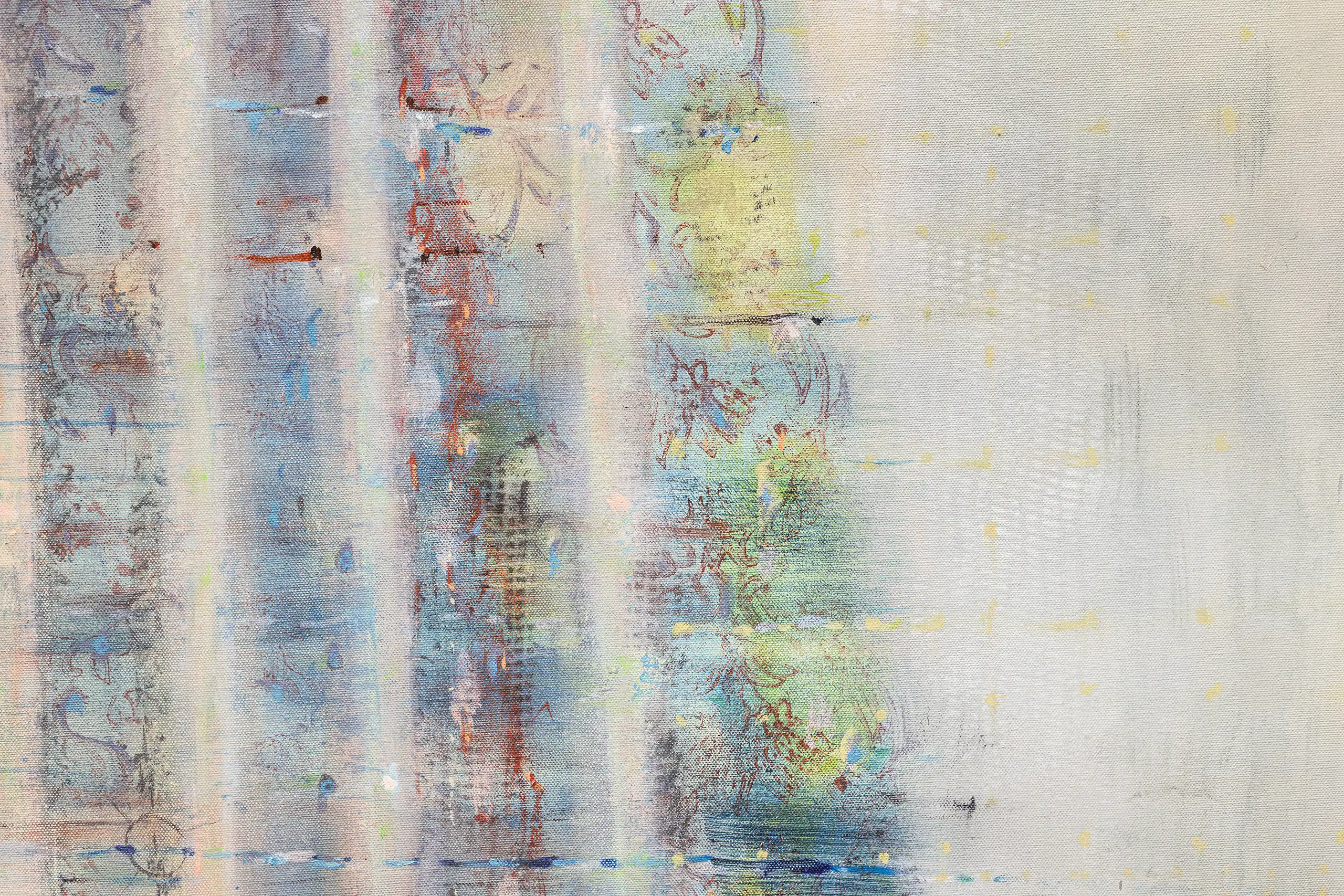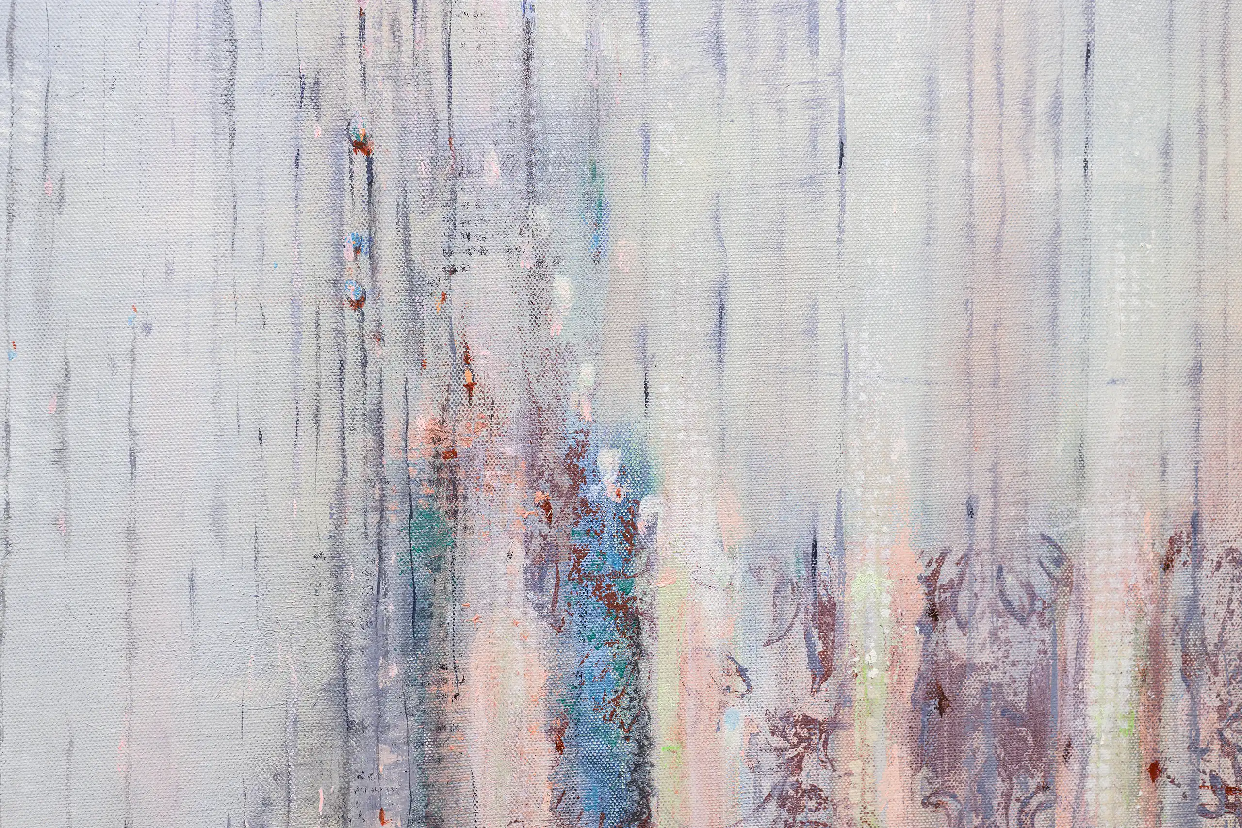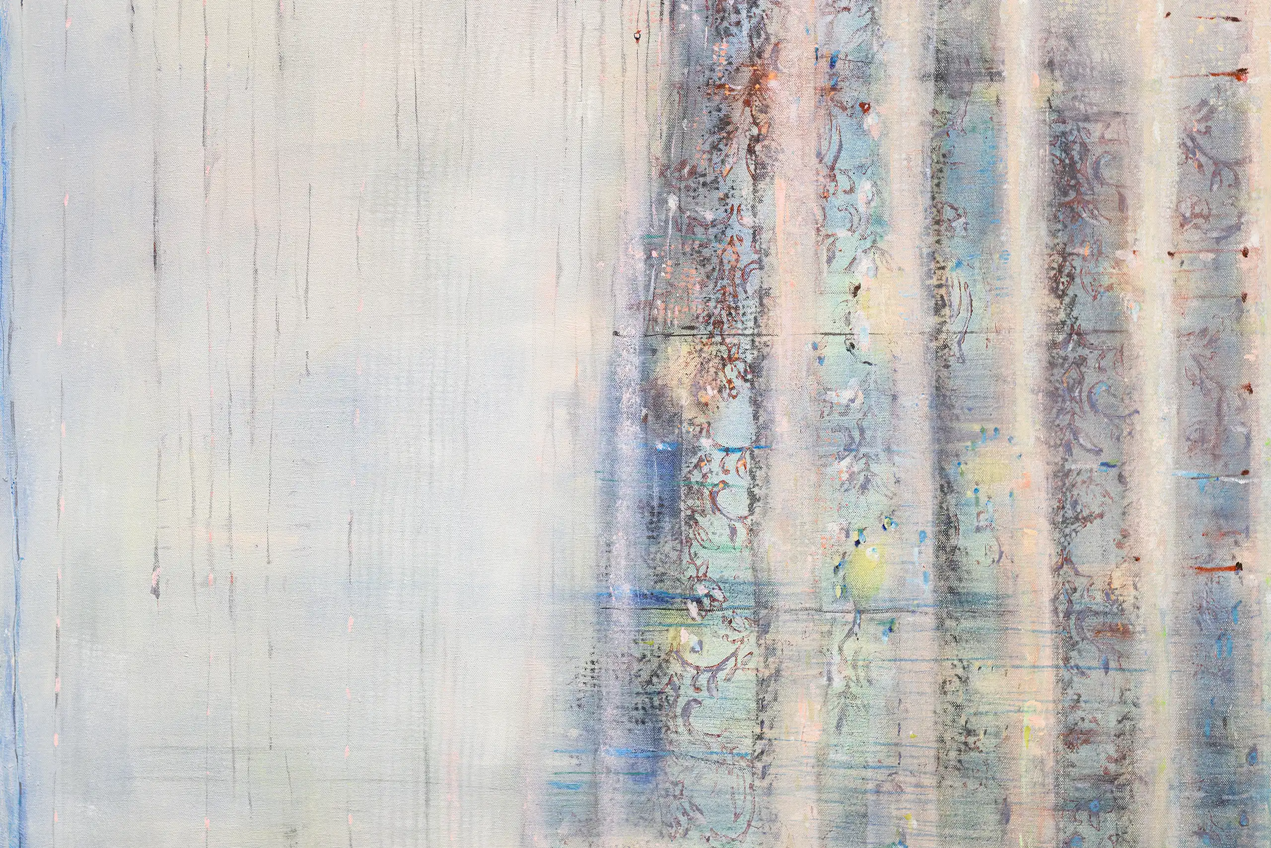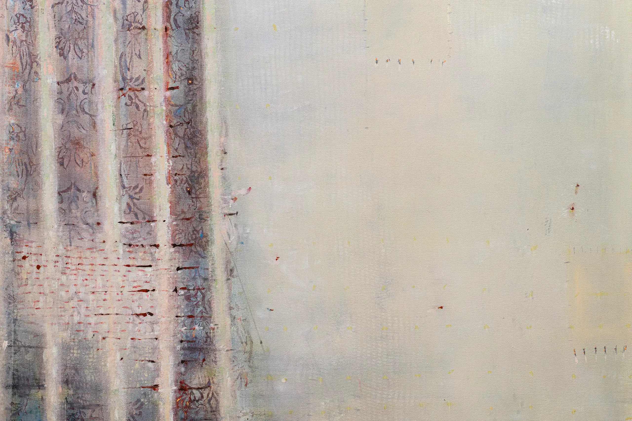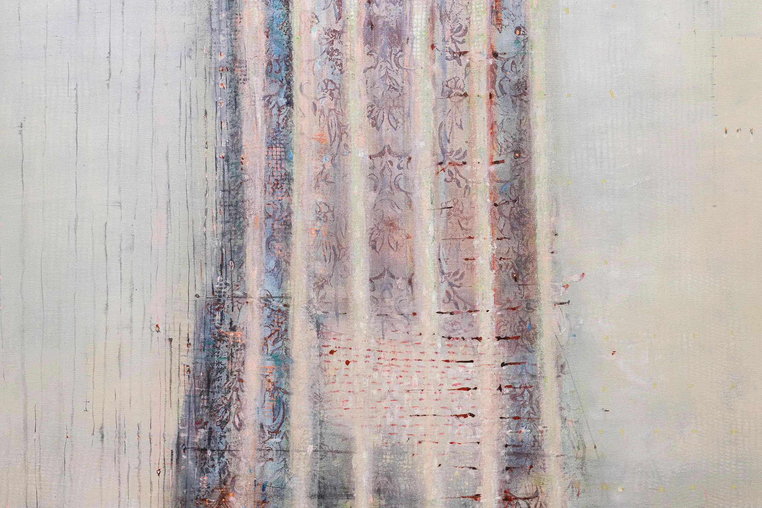 My painting process is that of patiently and delicately building up thin layers of oil paint on canvas, forms lying over forms, feeling nearer or further away in relation to one another. Past ages of paint disappear, saturate, and edges dissolve, or I will rub back to reveal the history that has been. I savour the handling of paint. The pulsating mark-making will then contrast with a rhythmic movement of washes of colour that stain or move across the plane. The paintings emerge. They need time. I am drawn to a vital physicality in the act of painting.