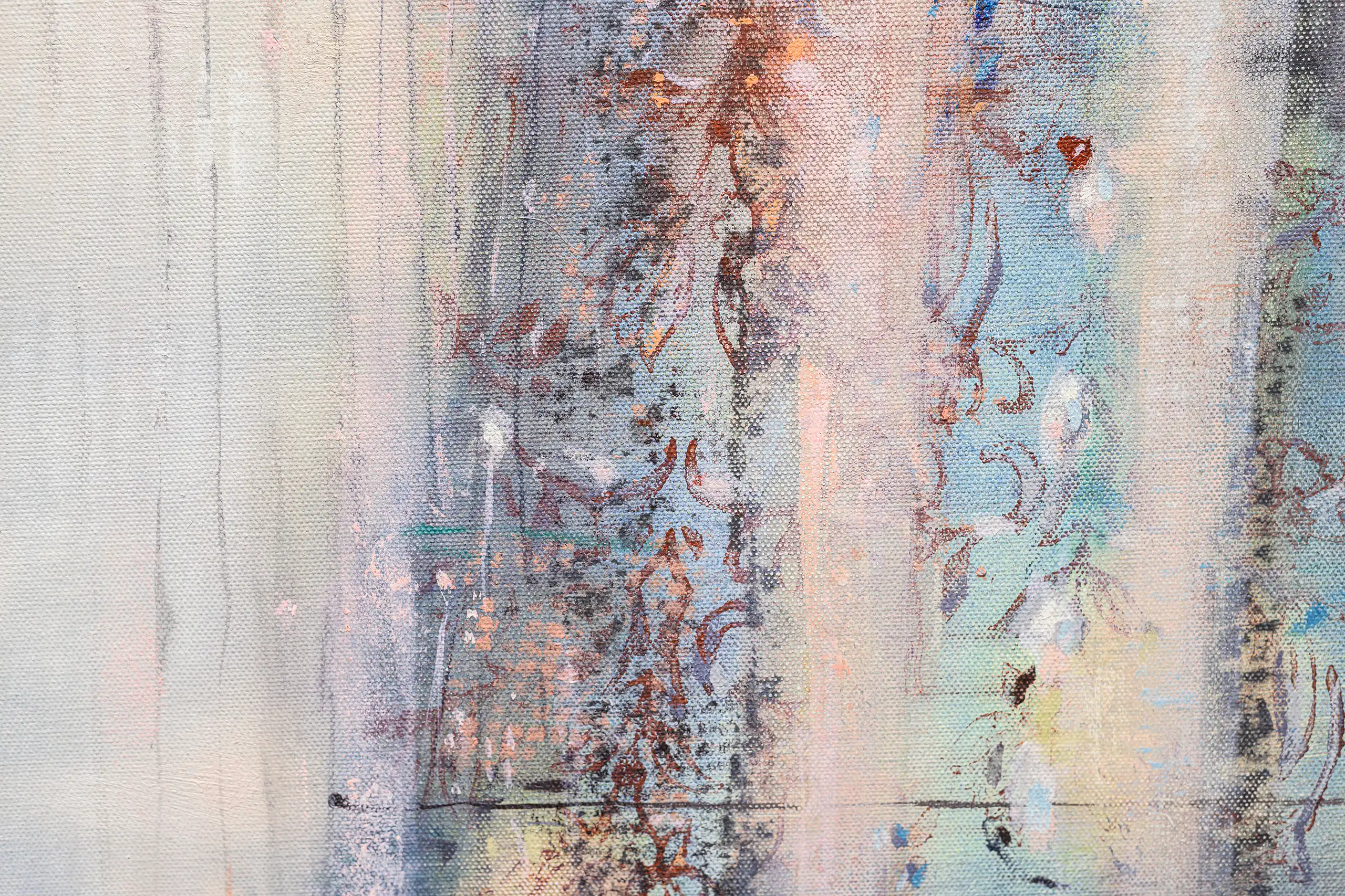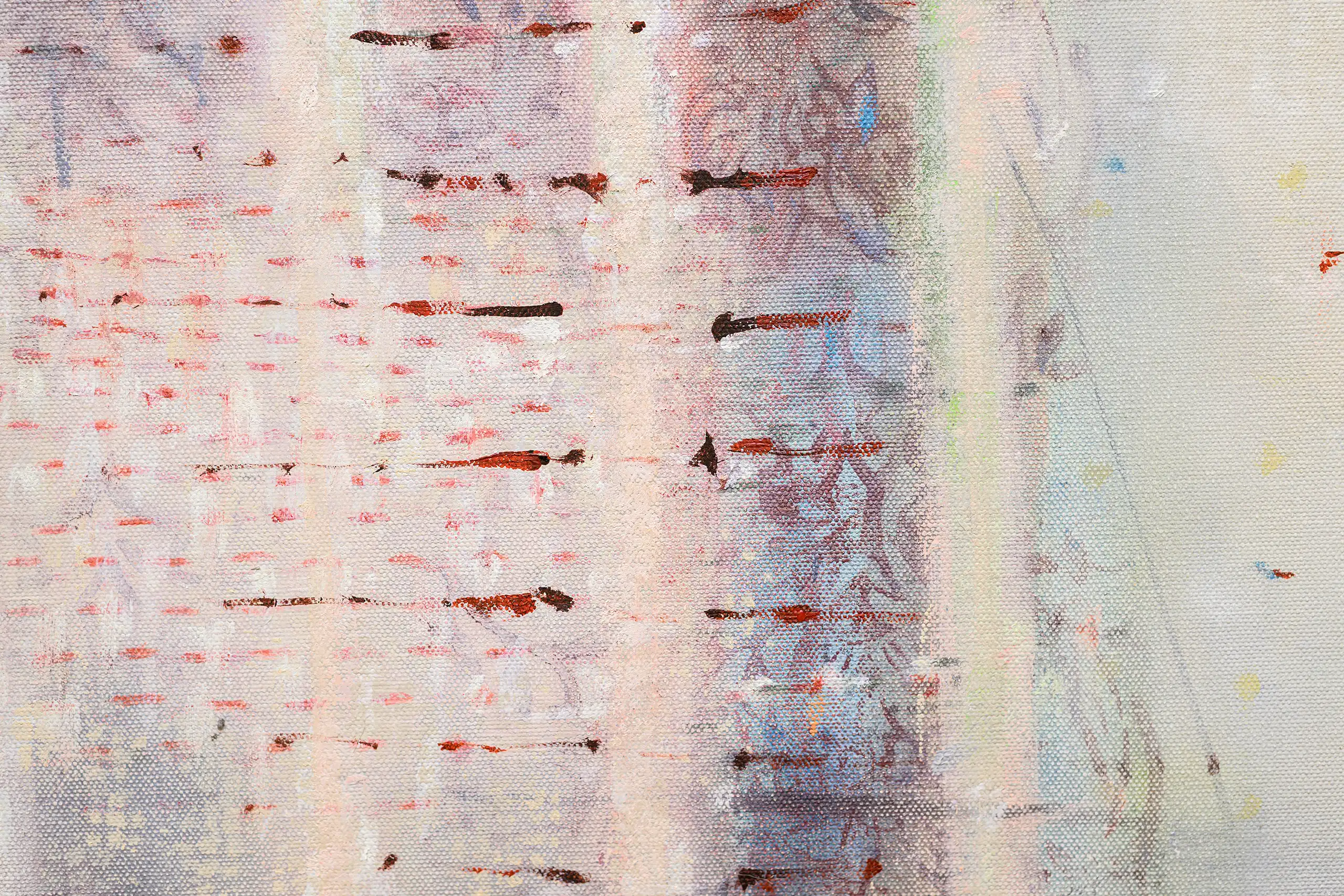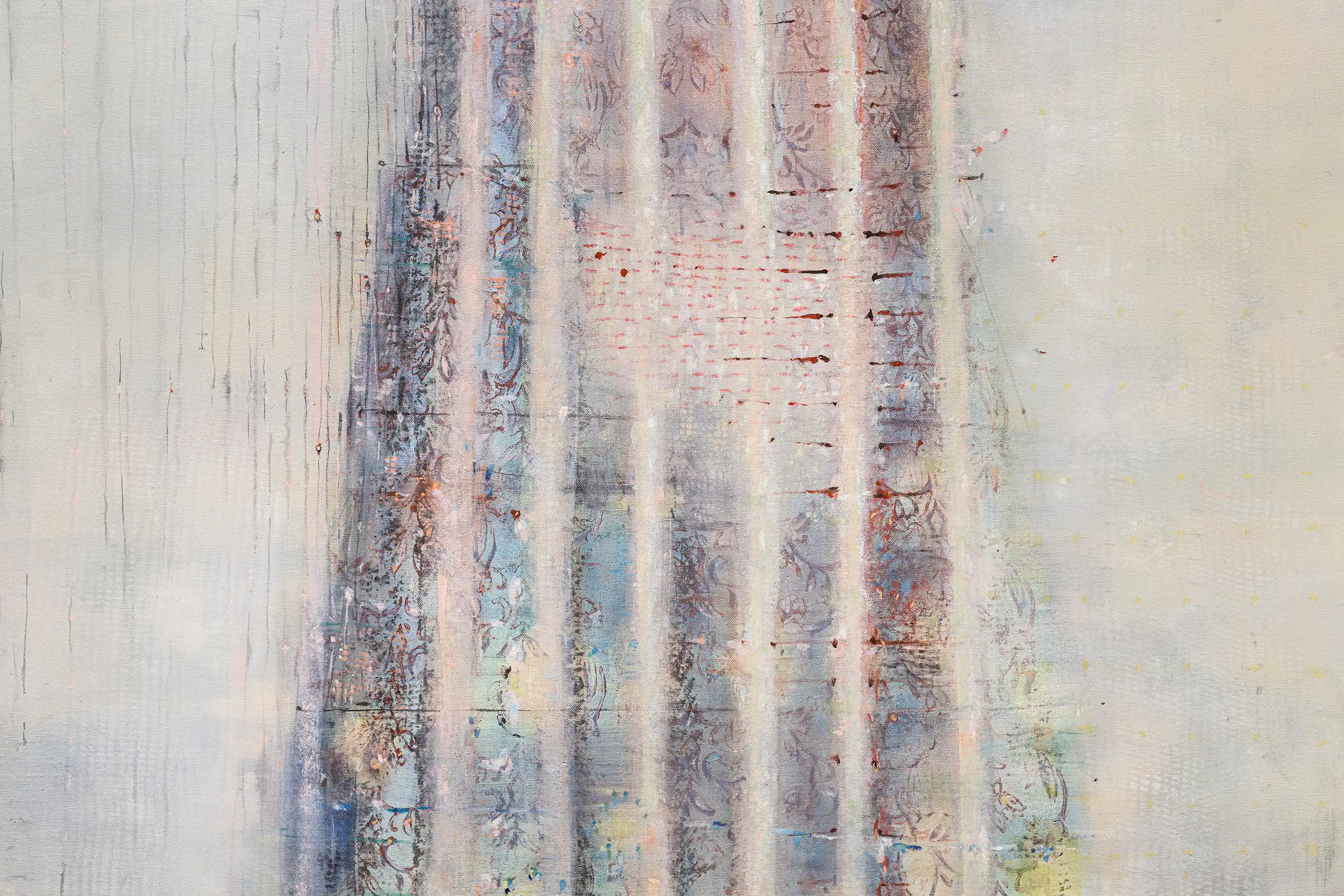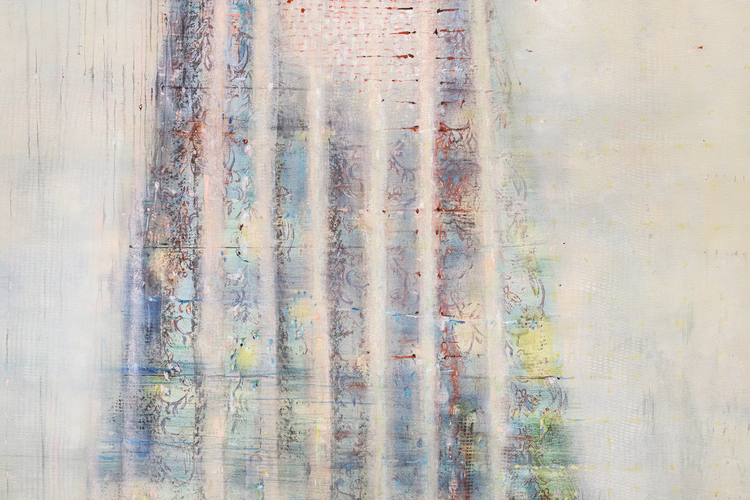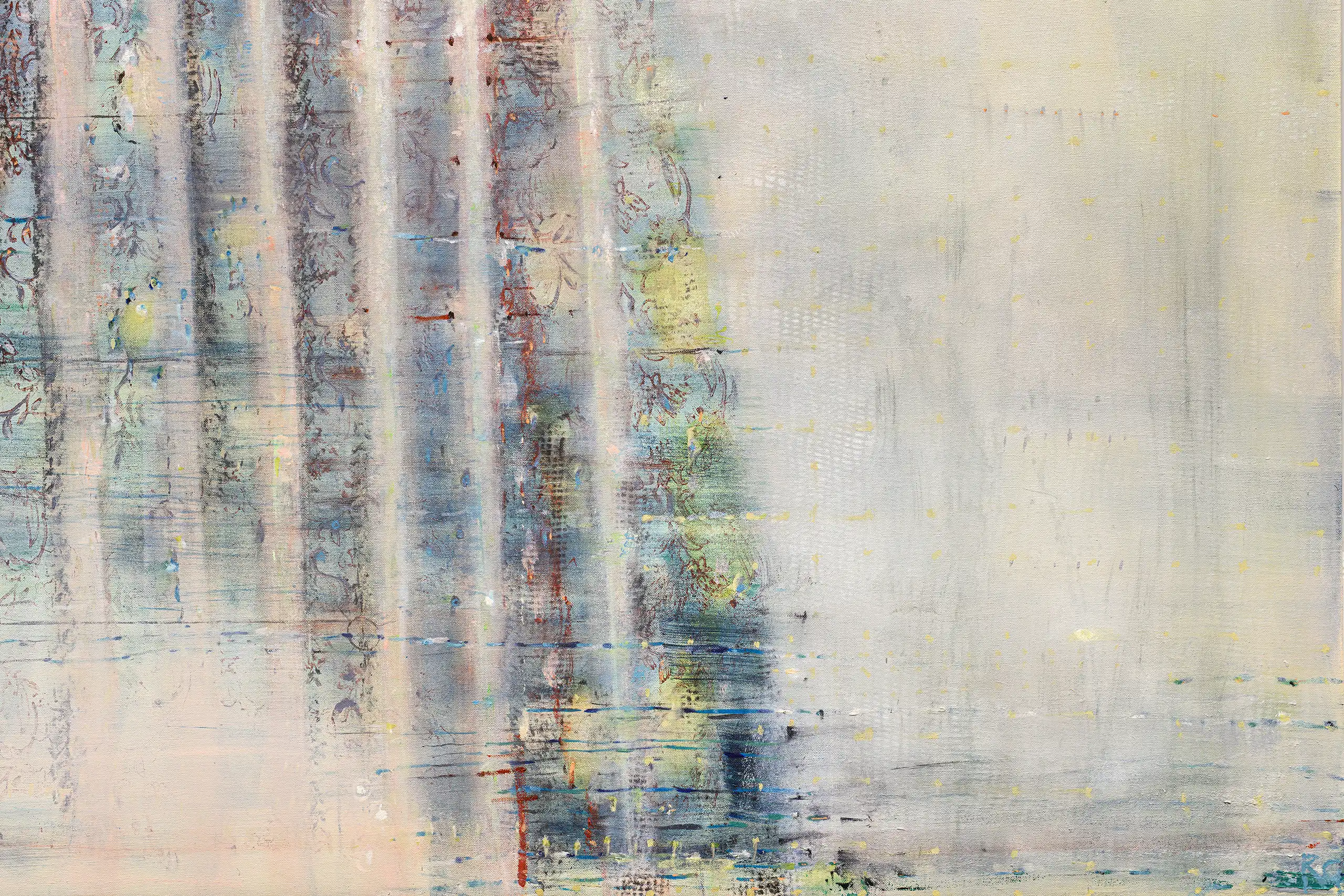 My painting process is that of patiently and delicately building up thin layers of oil paint on canvas, forms lying over forms, feeling nearer or further away in relation to one another. Past ages of paint disappear, saturate, and edges dissolve, or I will rub back to reveal the history that has been. I savour the handling of paint. The pulsating mark-making will then contrast with a rhythmic movement of washes of colour that stain or move across the plane. The paintings emerge. They need time. I am drawn to a vital physicality in the act of painting.