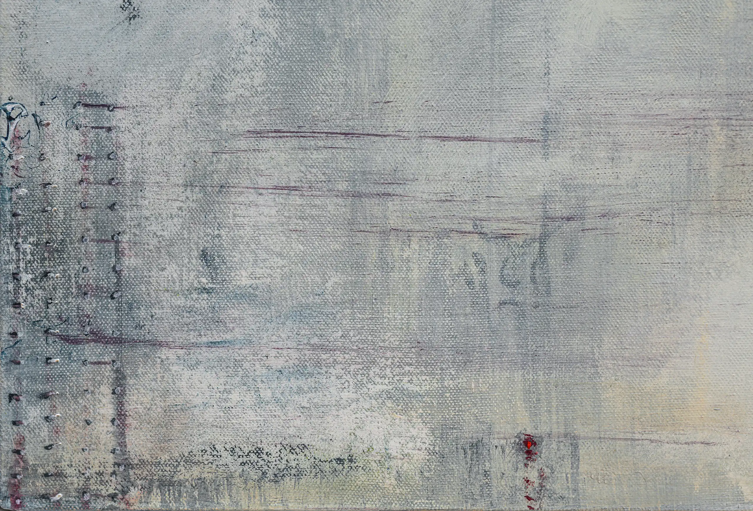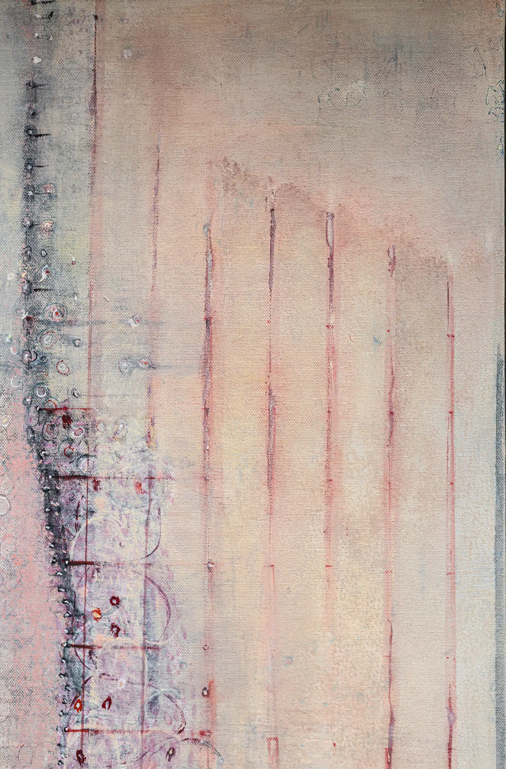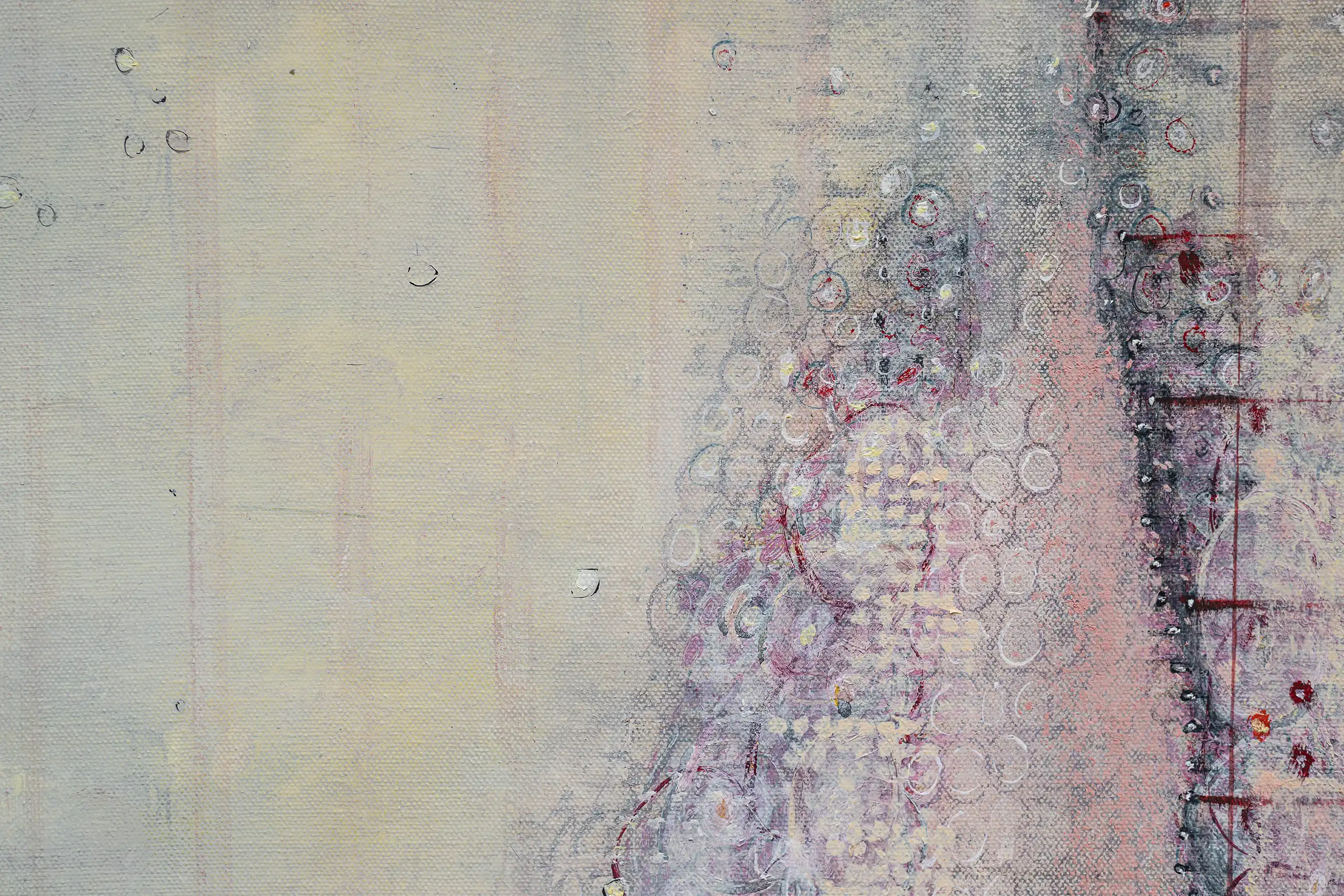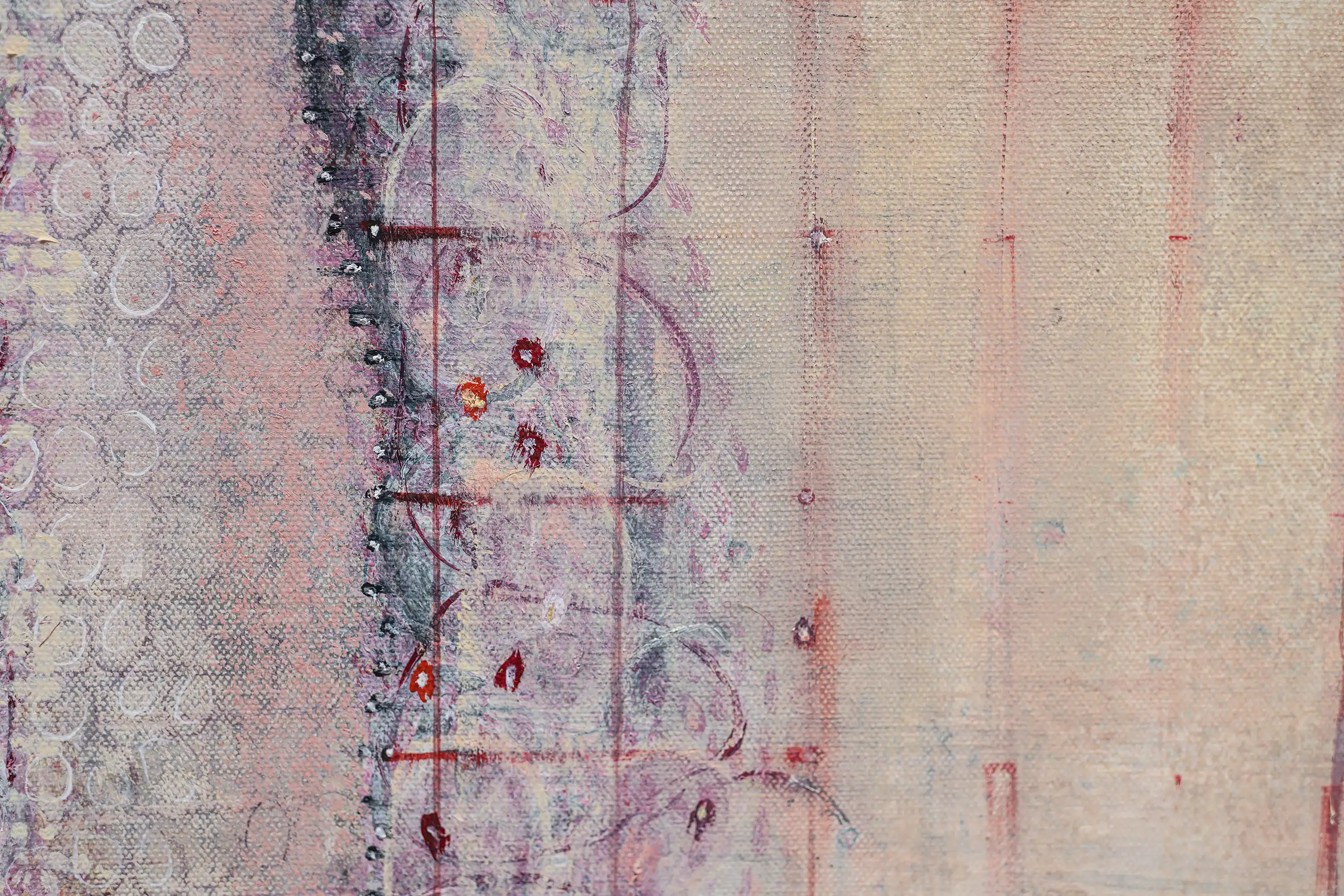 Peeling, torn, fragile surfaces that echo a sense of vulnerability, exposure, neglect yet they could also be of protection and boundary. Shards of memory shift and form new layers of pattern, which over time may reveal emotional states or unresolved traumas that lurk and bubble beneath the surface. Human memory retains, preserves and recovers but this is not a flawless process. Memory can be mercurial. Still areas within the space cocoon centres of possible tension or inflammation which, in part, suggest chainmail-like armour. Small circles weave to form a fabric mesh that is hard to penetrate but not impossible. There is a sense of fasteners or hooks that can enclose and mend or open and expose. A history of etched marks, maybe from a needle that has broken the surface to repair a fleshy bruised wound or a brittle garment. Stitches pull, stretch and strain – they may be constricting or instead liberating, shining a light or obscuring the narrative. A defiant rebellion against rigid constraints.