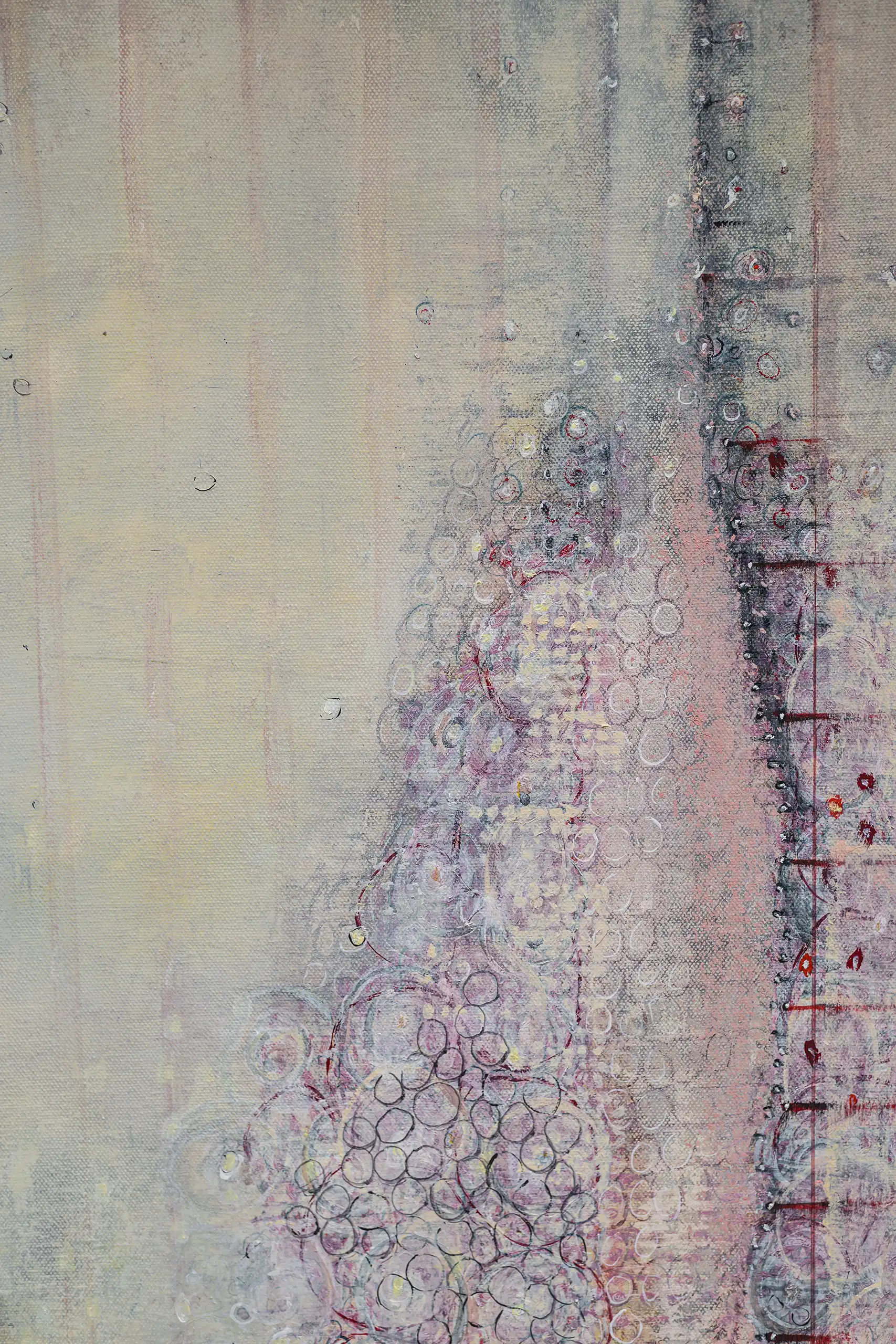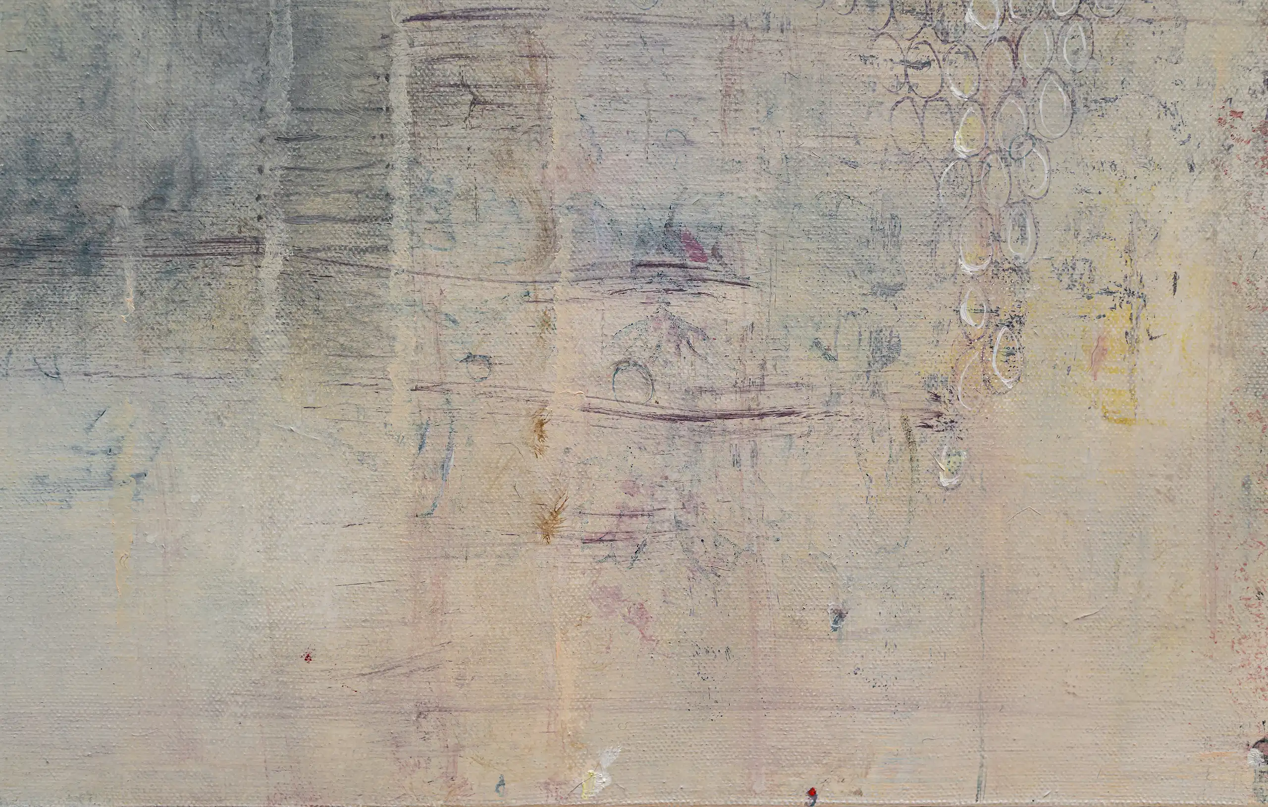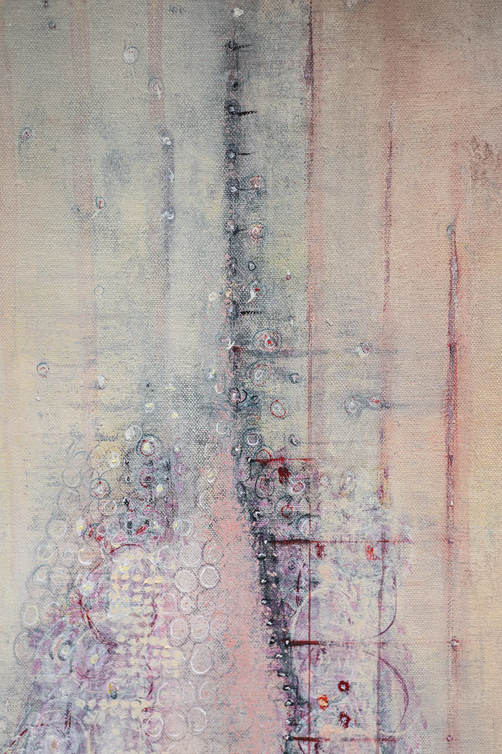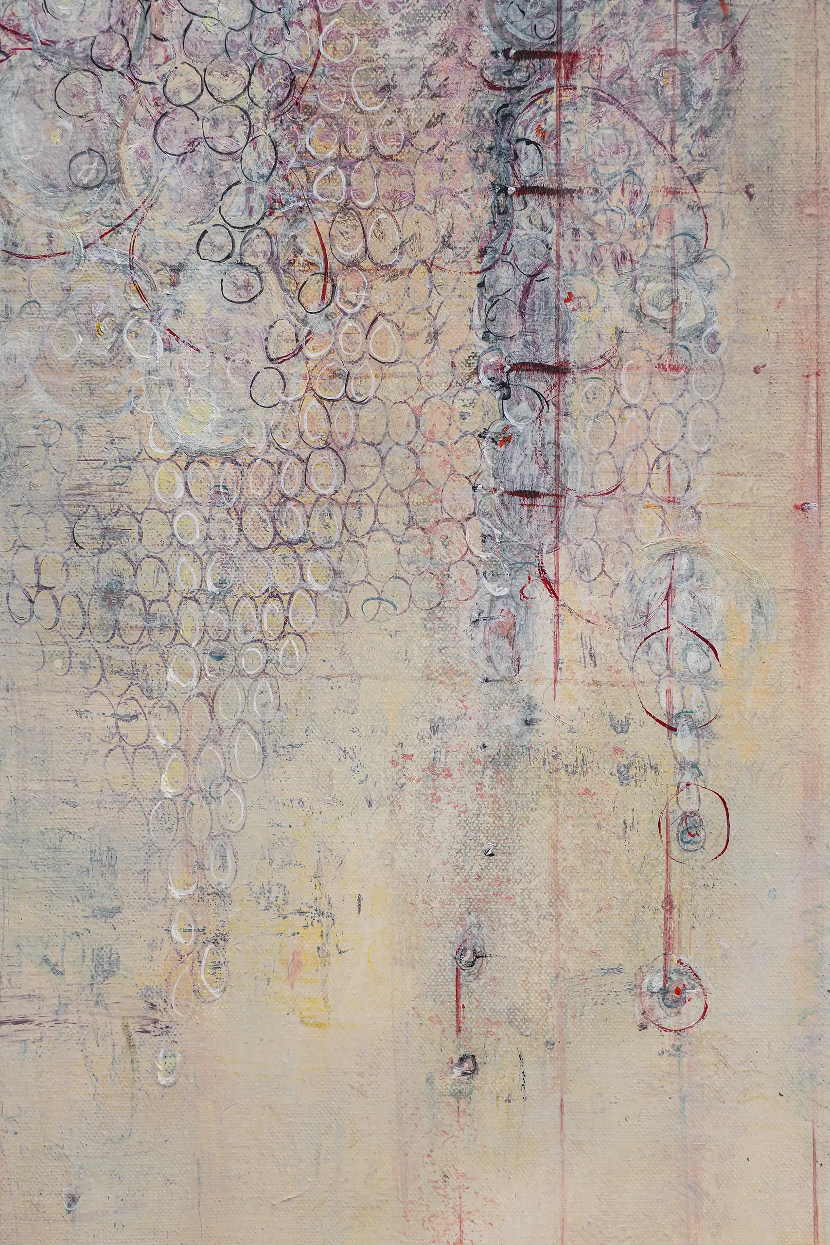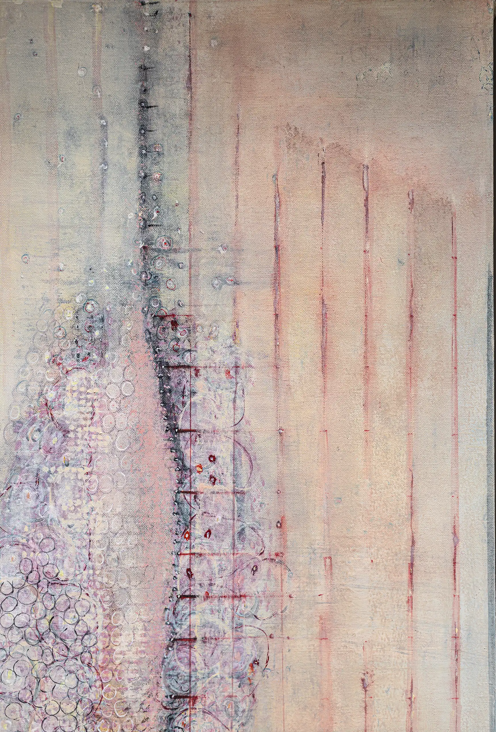 Peeling, torn, fragile surfaces that echo a sense of vulnerability, exposure, neglect yet they could also be of protection and boundary. Shards of memory shift and form new layers of pattern, which over time may reveal emotional states or unresolved traumas that lurk and bubble beneath the surface. Human memory retains, preserves and recovers but this is not a flawless process. Memory can be mercurial. Still areas within the space cocoon centres of possible tension or inflammation which, in part, suggest chainmail-like armour. Small circles weave to form a fabric mesh that is hard to penetrate but not impossible. There is a sense of fasteners or hooks that can enclose and mend or open and expose. A history of etched marks, maybe from a needle that has broken the surface to repair a fleshy bruised wound or a brittle garment. Stitches pull, stretch and strain – they may be constricting or instead liberating, shining a light or obscuring the narrative. A defiant rebellion against rigid constraints.