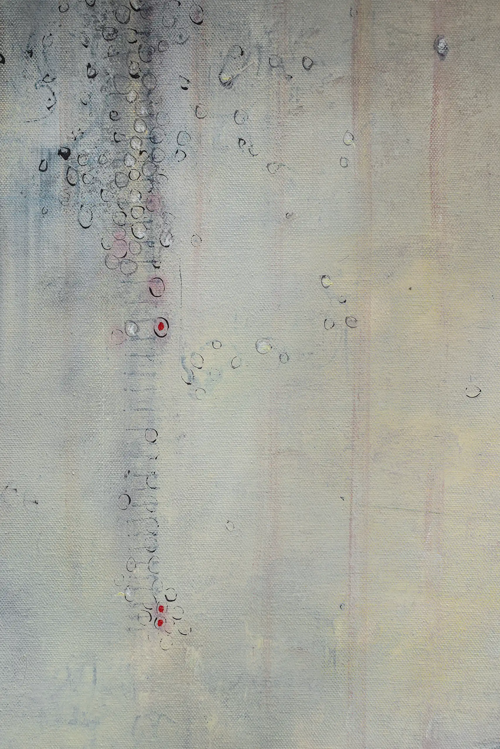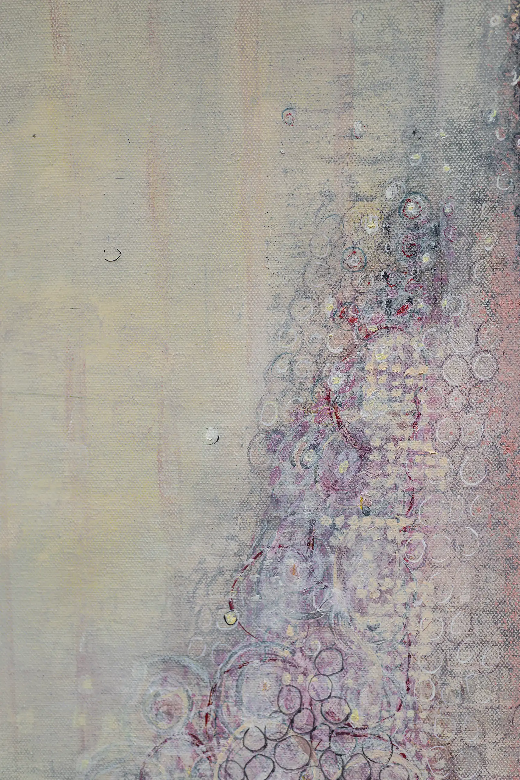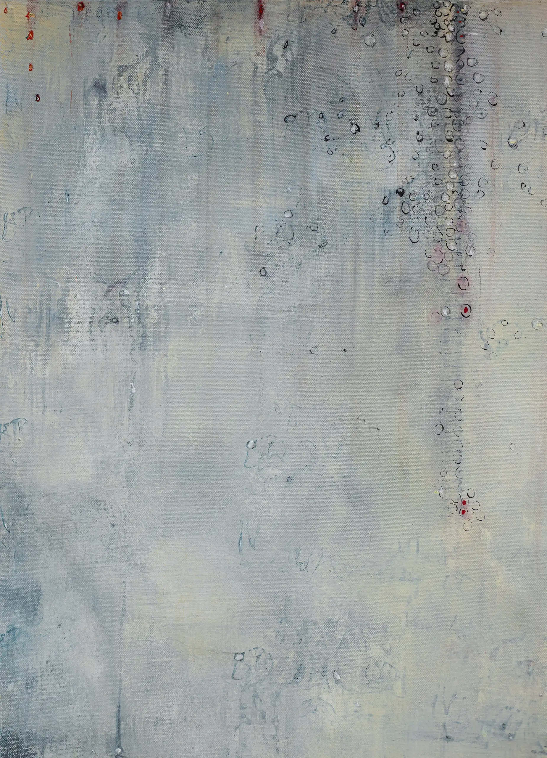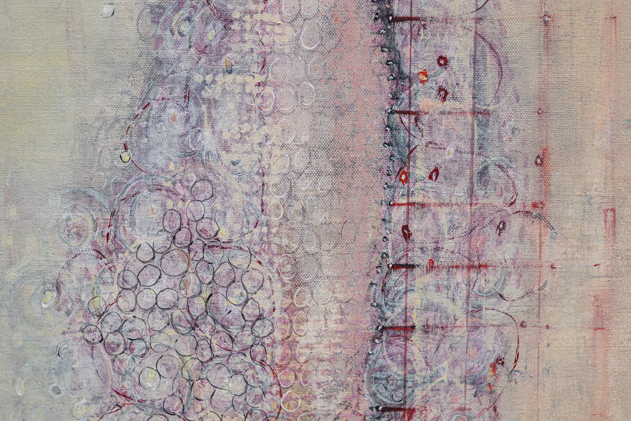 Peeling, torn, fragile surfaces that echo a sense of vulnerability, exposure, neglect yet they could also be of protection and boundary. Shards of memory shift and form new layers of pattern, which over time may reveal emotional states or unresolved traumas that lurk and bubble beneath the surface. Human memory retains, preserves and recovers but this is not a flawless process. Memory can be mercurial. Still areas within the space cocoon centres of possible tension or inflammation which, in part, suggest chainmail-like armour. Small circles weave to form a fabric mesh that is hard to penetrate but not impossible. There is a sense of fasteners or hooks that can enclose and mend or open and expose. A history of etched marks, maybe from a needle that has broken the surface to repair a fleshy bruised wound or a brittle garment. Stitches pull, stretch and strain – they may be constricting or instead liberating, shining a light or obscuring the narrative. A defiant rebellion against rigid constraints.