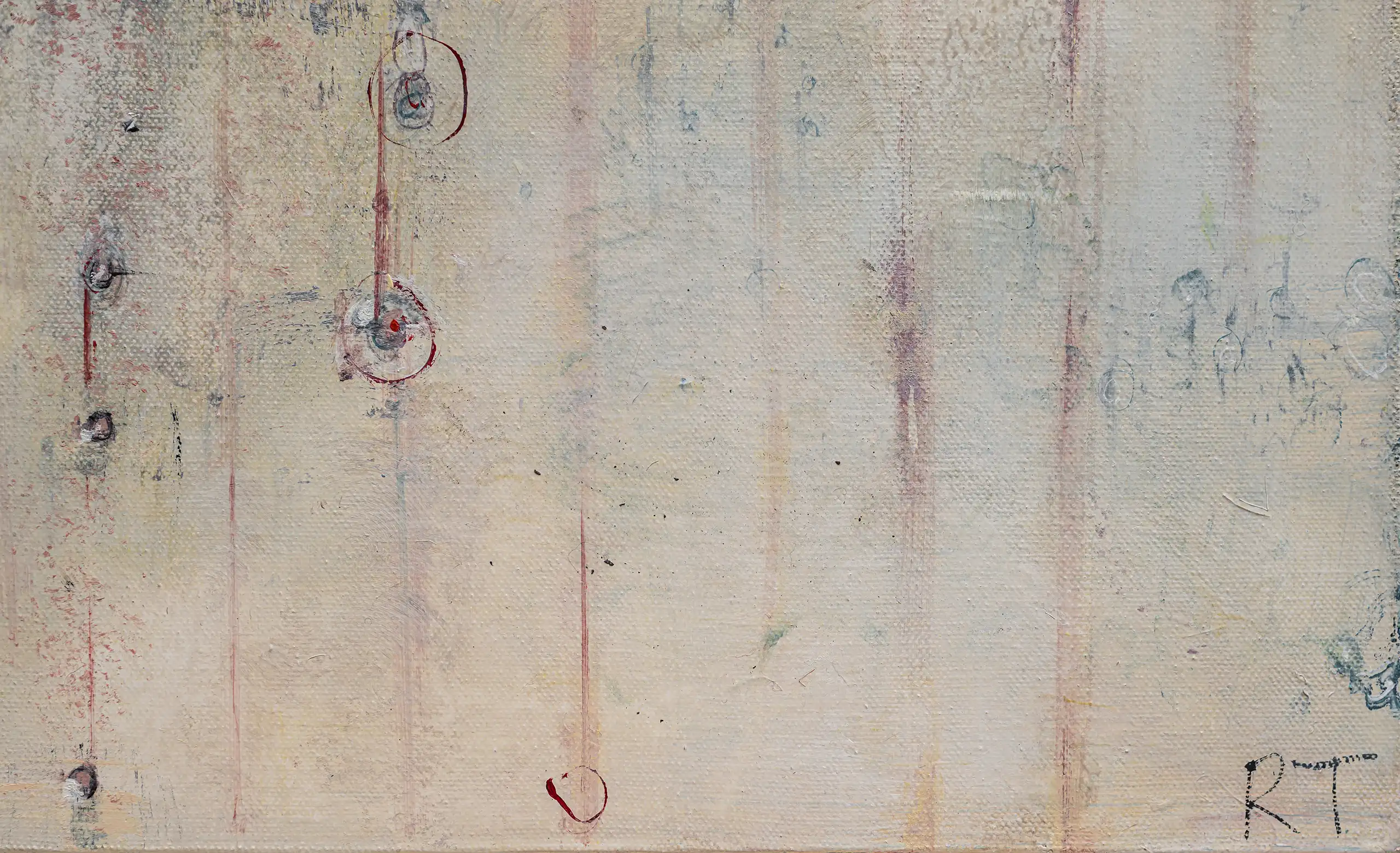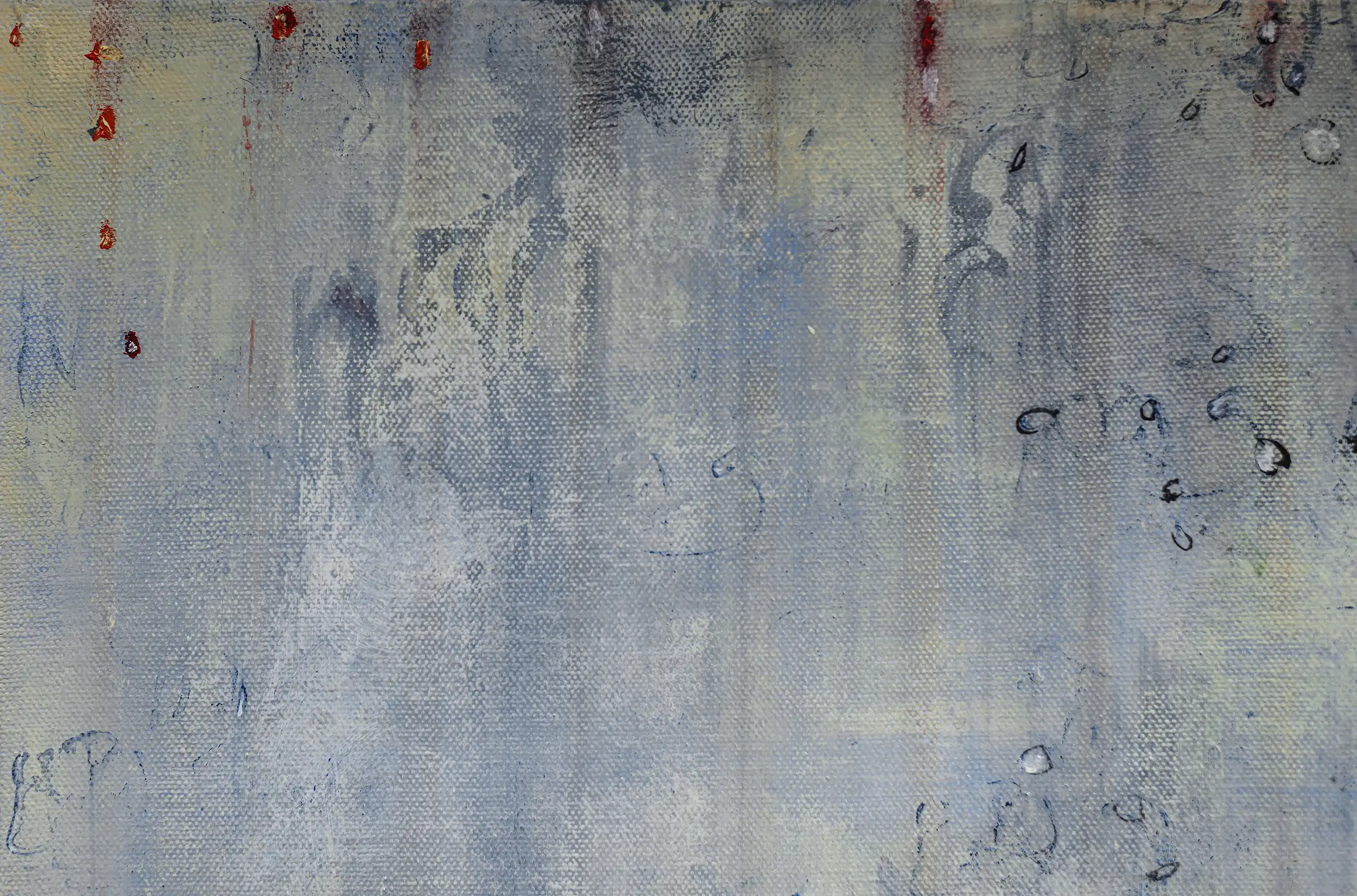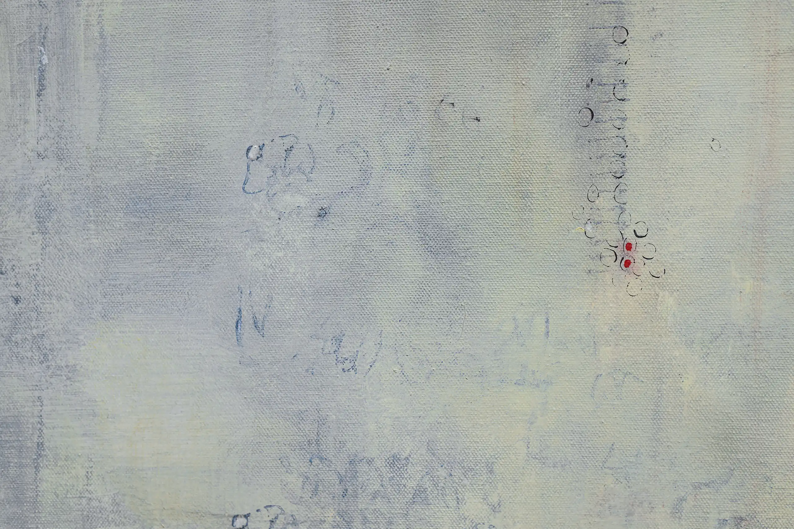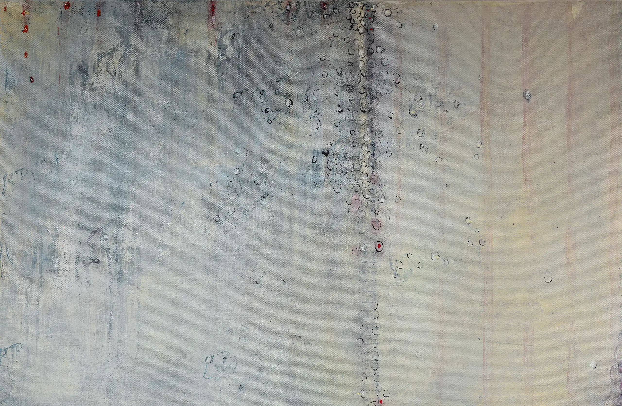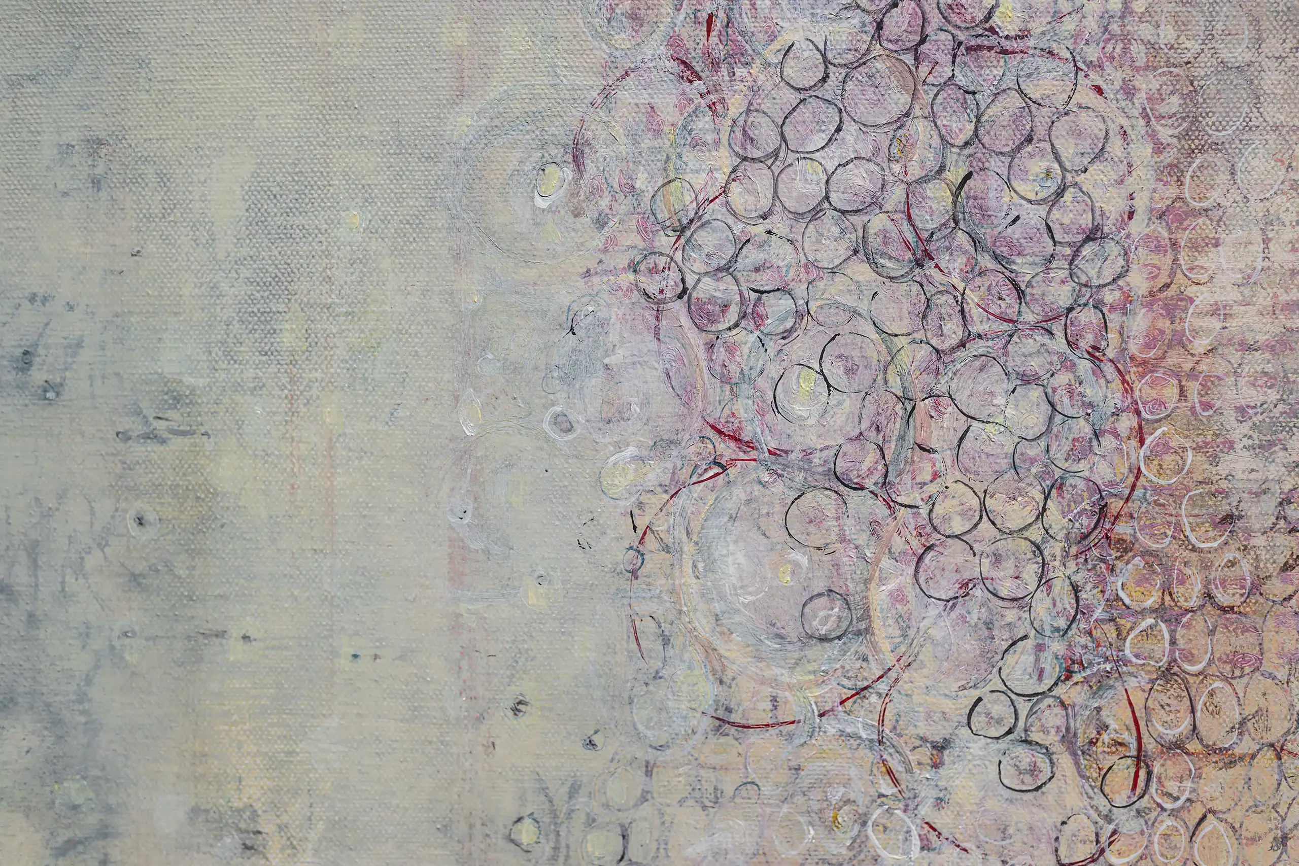 Peeling, torn, fragile surfaces that echo a sense of vulnerability, exposure, neglect yet they could also be of protection and boundary. Shards of memory shift and form new layers of pattern, which over time may reveal emotional states or unresolved traumas that lurk and bubble beneath the surface. Human memory retains, preserves and recovers but this is not a flawless process. Memory can be mercurial. Still areas within the space cocoon centres of possible tension or inflammation which, in part, suggest chainmail-like armour. Small circles weave to form a fabric mesh that is hard to penetrate but not impossible. There is a sense of fasteners or hooks that can enclose and mend or open and expose. A history of etched marks, maybe from a needle that has broken the surface to repair a fleshy bruised wound or a brittle garment. Stitches pull, stretch and strain – they may be constricting or instead liberating, shining a light or obscuring the narrative. A defiant rebellion against rigid constraints.